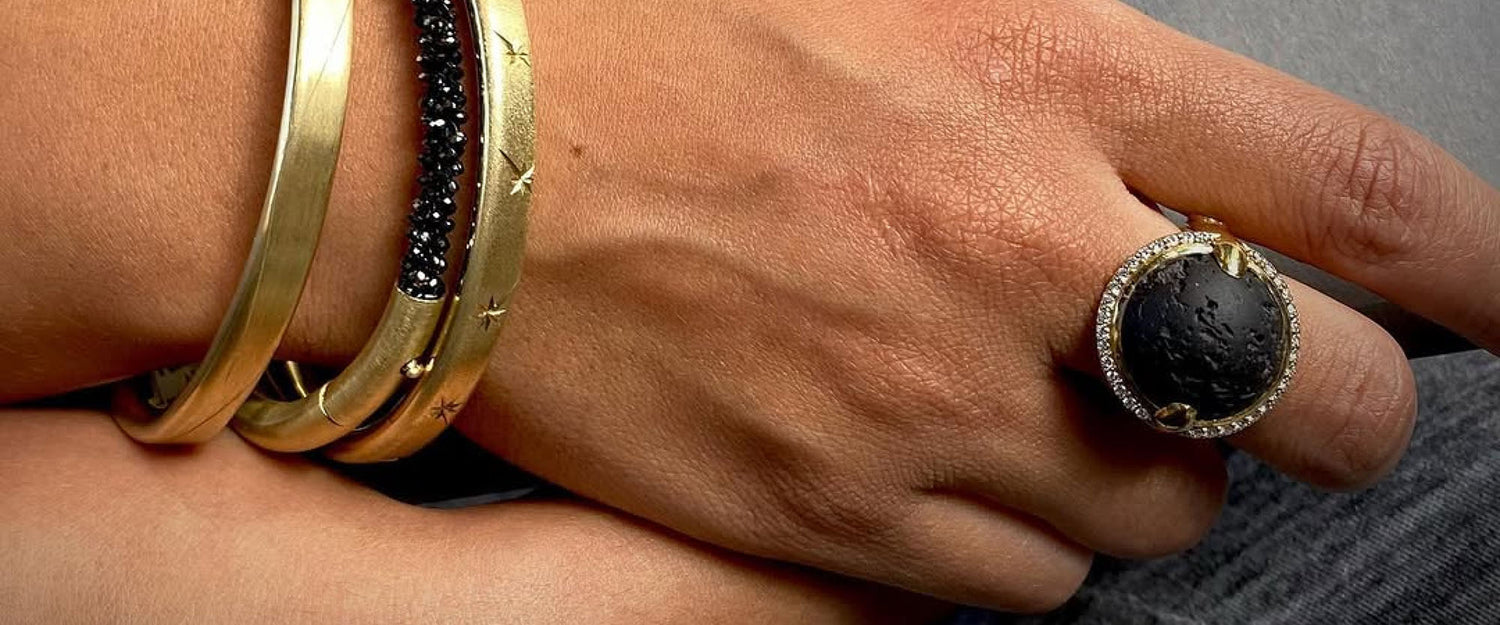 Inspired by the ancient Japanese art of folding paper into decorative shapes and figures, Adam creates a myriad of organic shapes and whimsical creatures utilizing the same concept with his Origami Collection. Sheets of thin gold are rolled and softened, and tiny polished pliers are used to create folds in each piece under a microscope. While some shapes call for 8 to 10 folds to complete, more intricate pieces need several hundred for completion.