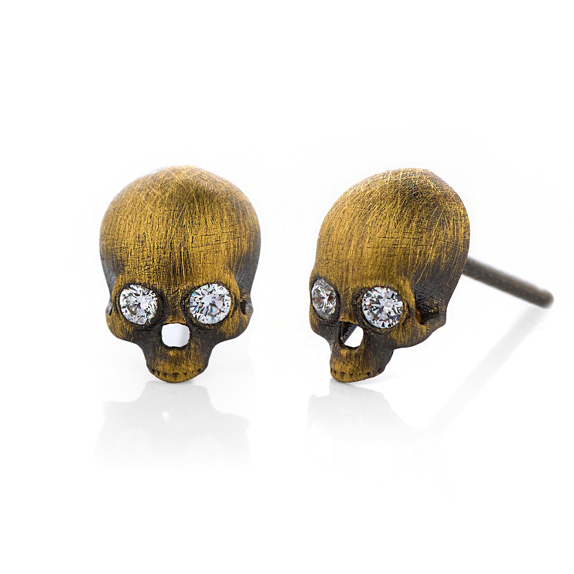 Adam's creation of a collection of skull earrings stems from his own personal affinity for skulls. This pair features an antique (brushed) yellow gold finish and have diamond accents set in the eyes.