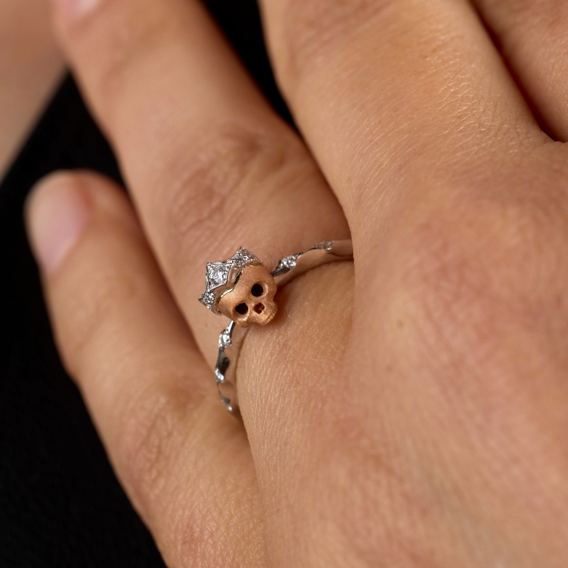 Inspired by the juxtaposition of skulls representing not only death and mortality, but also power and protection, Adam created this ring as a melding of the different symbols. The rose gold skull head is topped with a diamond crown, and the white gold band is accented with diamonds as well.