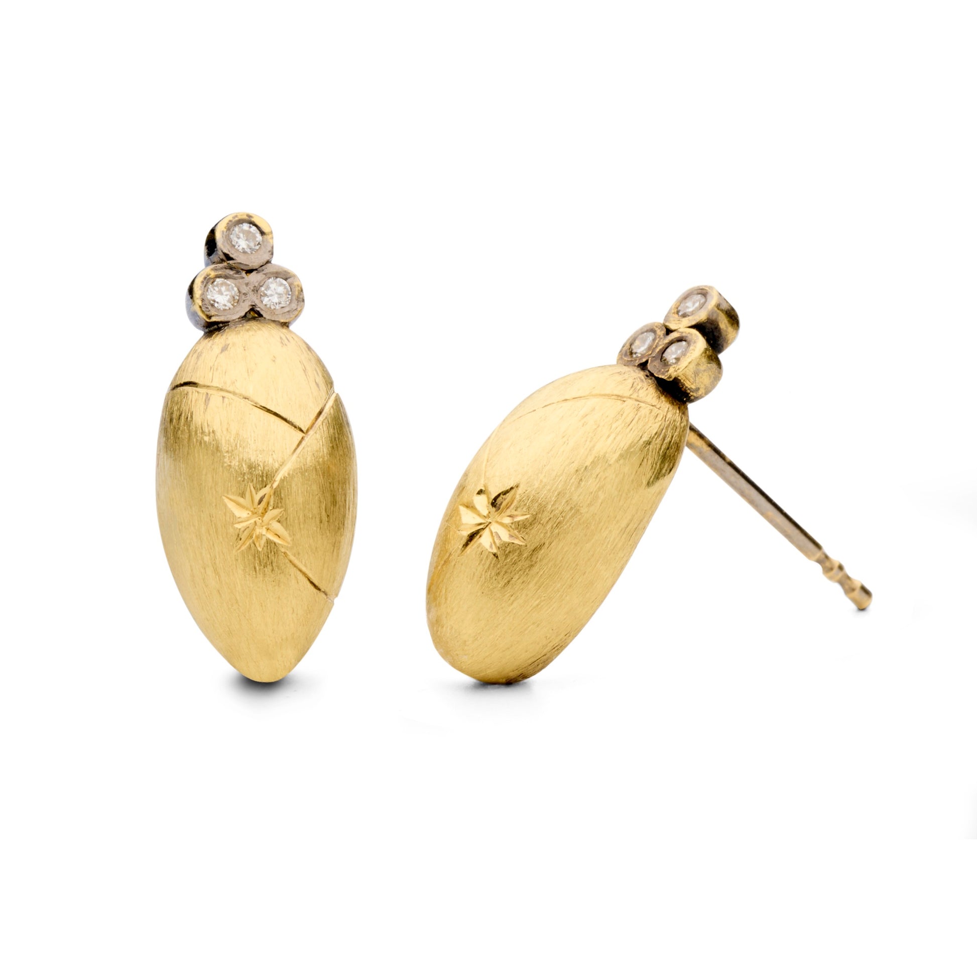 From Adam's signature Constellation Collection, these teardrop earrings features a brushed Florentine finish and a trio of accent diamonds in 18k yellow gold. The earrings also have hand-carved starbursts, completed by hand in Adam's St. Louis-based studio.